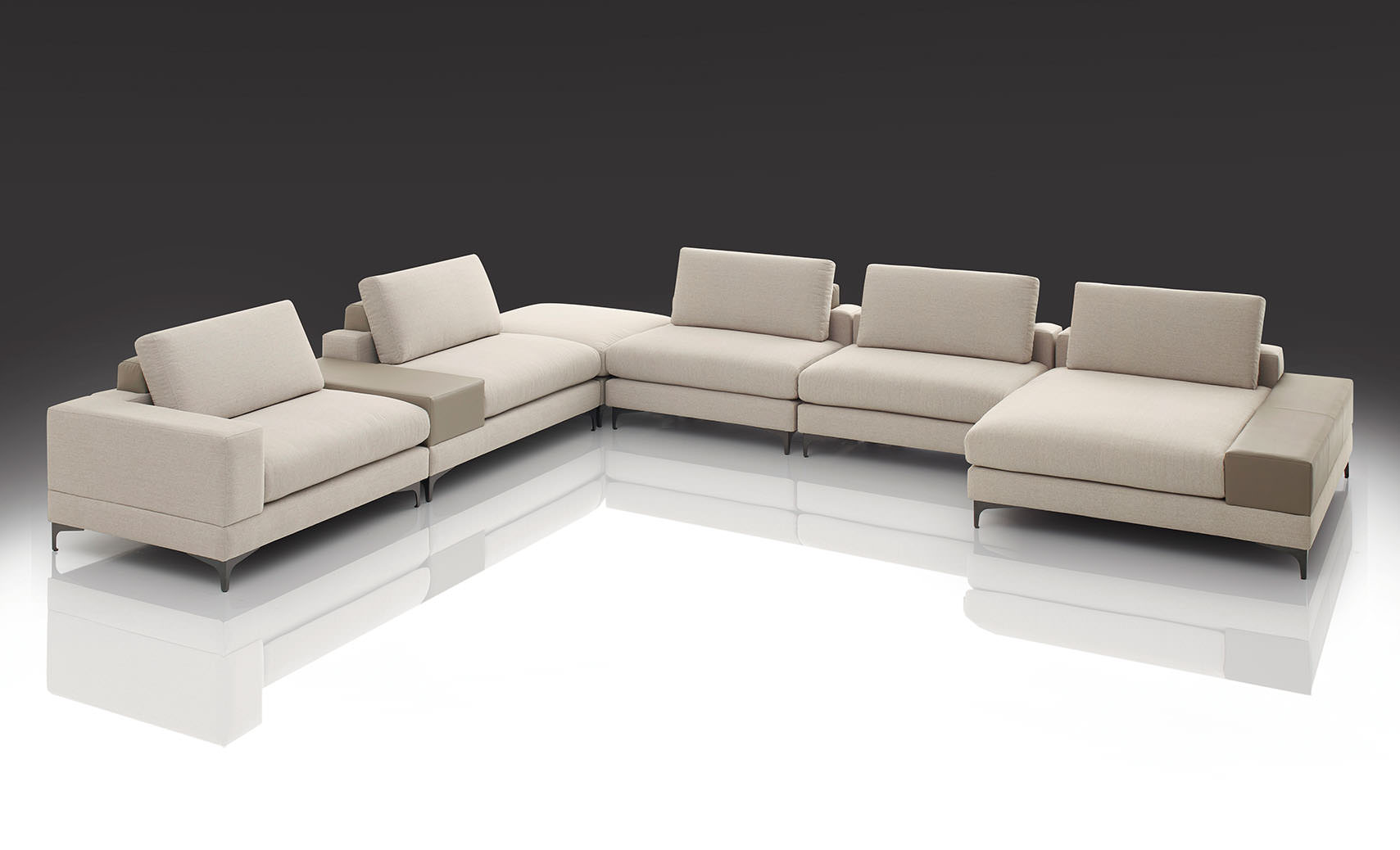 OBSERVAÇÃO: Para definir o lado da chaise, posicionar-se de frente para a peça. Opção de braços em tecido, courissimo, couro natural ou madeira laminada na cor carvalho e nogueira. Pés na cor grafite. Almofadas de encosto soltas.