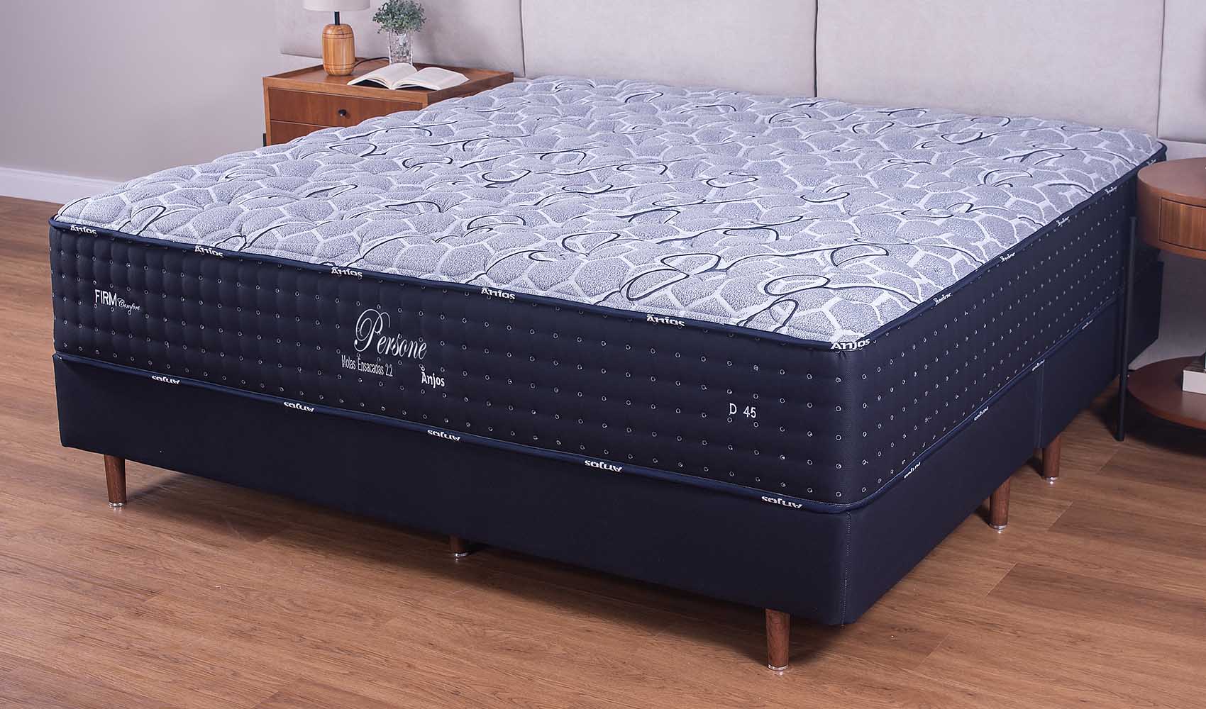 Com incrível maciez ao toque o Persone tem tampo em malha trabalhada em desenho sofisticado com alto relevo. Com tratamento Hugstar, apresenta fragrâncias calmantes de lavanda, baunilha, camomila entre outras que garantem uma noite de sono relaxante. As faixas laterais em linho azul marinho de alta decoração conferem imponência ao modelo.