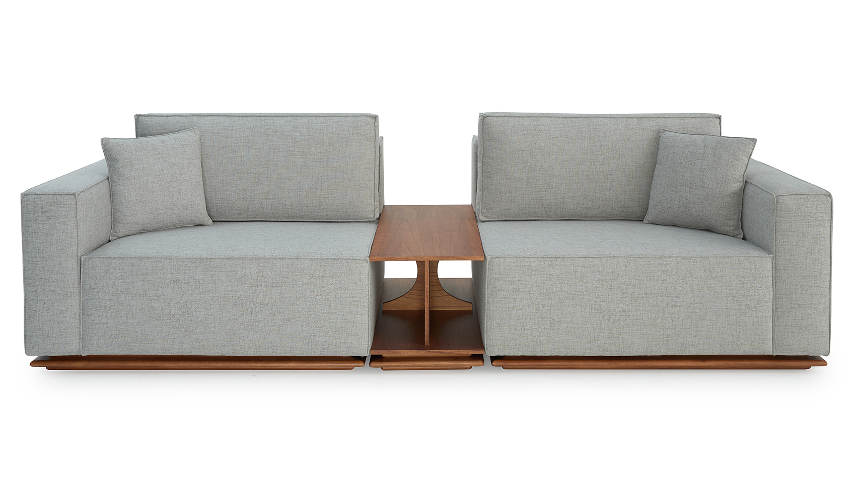 O Sofá Lione combina praticidade e charme em um design sofisticado. Com uma mesa de centro integrada em madeira situada entre as poltronas, ele oferece conveniência e um toque de elegância ao seu ambiente.